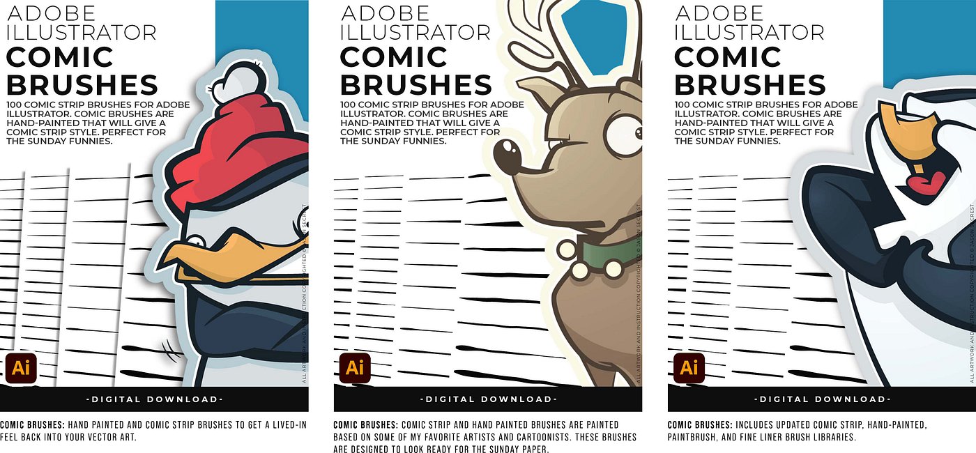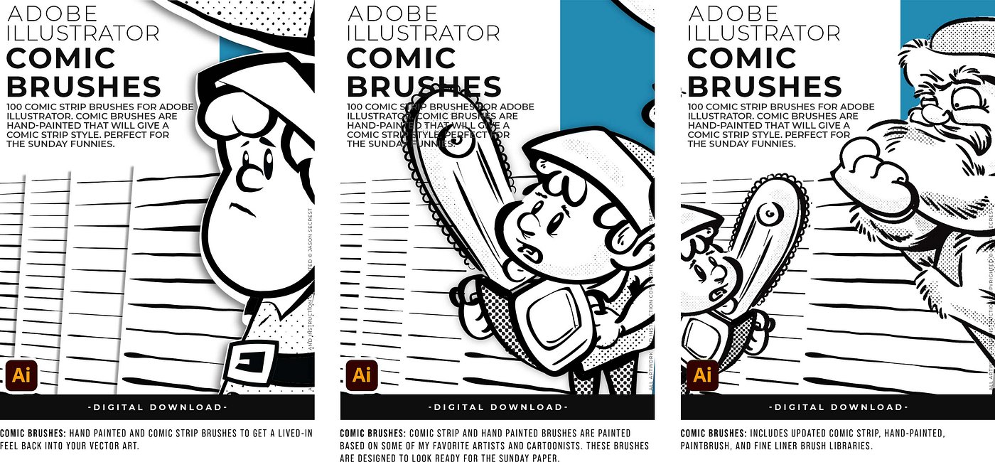 Hand-painted and Comic Strip Brushes to get a lived-in feel back into your Vector Art. Comic Strips and Hand Painted are painted based on some of my favorite artists and cartoonists. These brushes are designed to look ready for the Sunday Paper. Use Brush Libraries with the Pen, Pencil, or Paint Brush Tools in Adobe Illustrator. Open Brush Libraries through the “User Defined” or “Other Library” Options in the Brushes Panel in Adobe Illustrator. Compatible with Adobe Illustrator CC through CS. 100 Comic Strip Brushes include Updated Comic Strip, Hand-Painted, Paintbrush, and Fine Liner Brush Libraries.