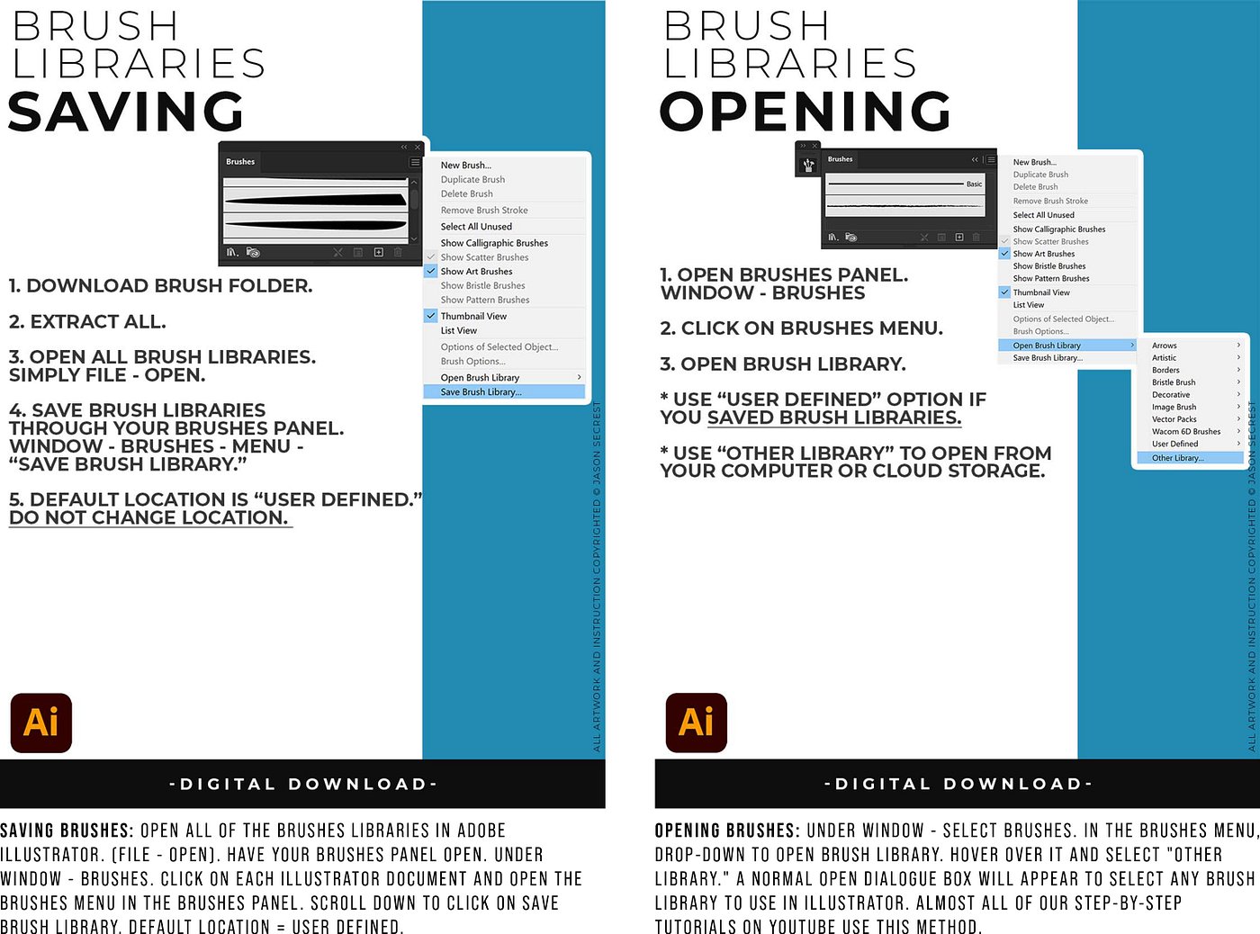 • For immediate use, Open Brush Libraries through the “Other Library” Option in the Brushes Panel in Adobe Illustrator.